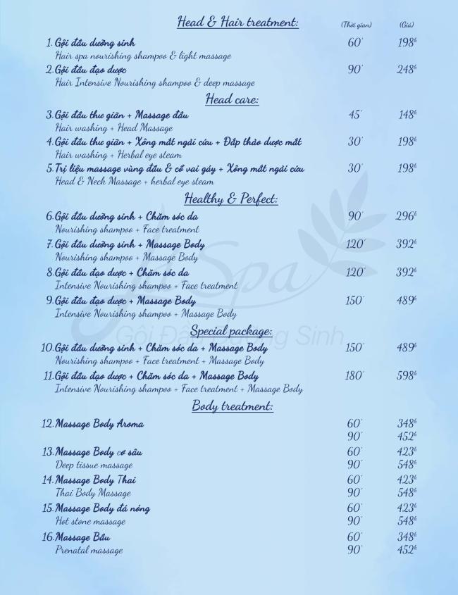 - Gội đầu dưỡng sinh:là chăm sóc tóc và da đầu một cách đặc biệt, kết hợp với việc massage vùng đầu, vai gáy, cổ, lưng,…làm sạch da đầu và tóc với các dầu gội thảo dược từ thiên nhiên như sả, bồ kết, vỏ bưởi, quế,…